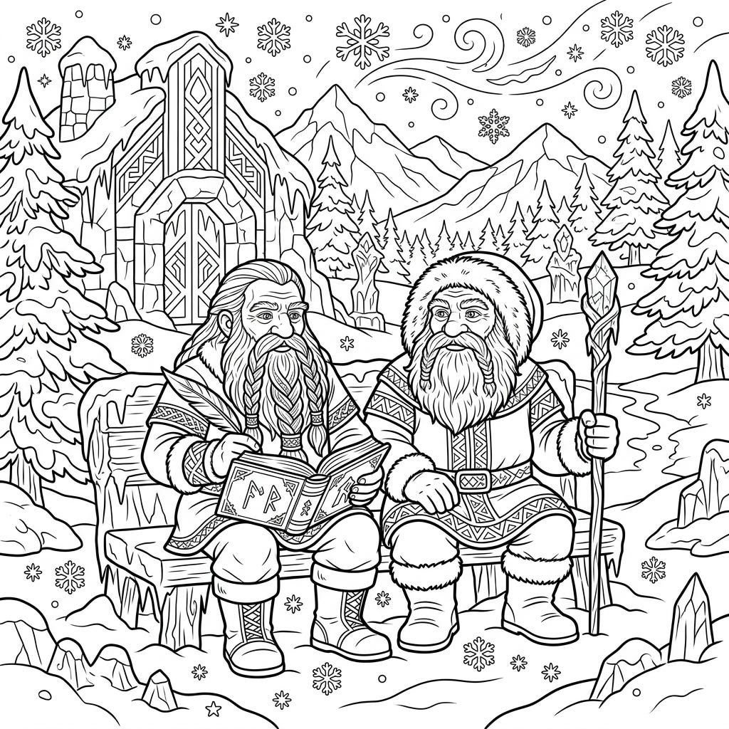 Immerse yourself in a magical winter scene featuring two revered Dwarf Clan Elders, sharing tales and wisdom amidst falling snow. This intricate coloring page invites you to bring their ancient world to life with your favorite colors.