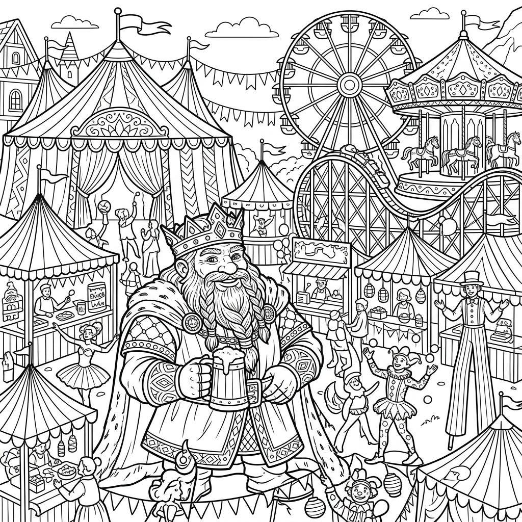 View coloring pageStep into a fantastical fairground where a majestic dwarf king reigns over the revelry. This intricate coloring page captures the vibrant energy of a magical carnival, ready for your creative touch.