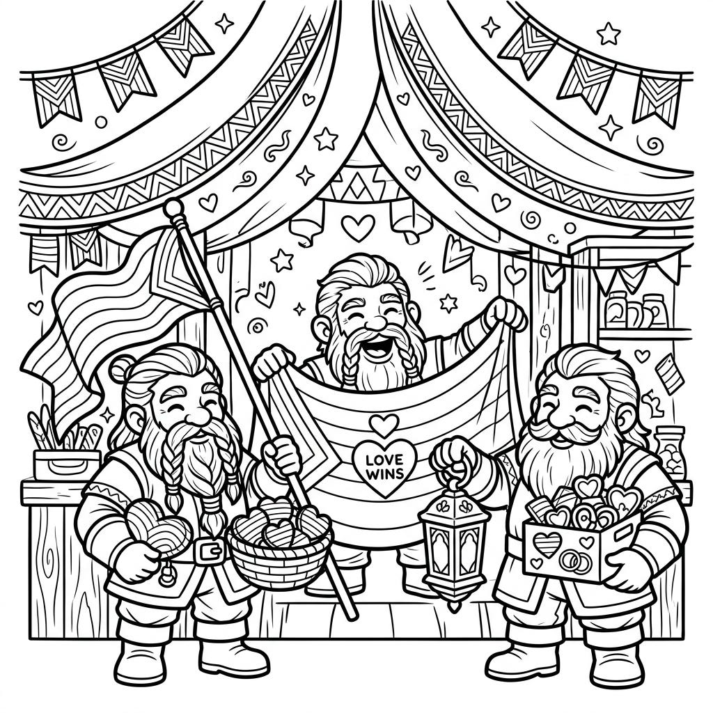 Three happy dwarf merchants are celebrating Pride Month with flags, banners, and heartwarming symbols of love. This delightful coloring page combines fantasy and festivity in a joyful display of community and diversity.