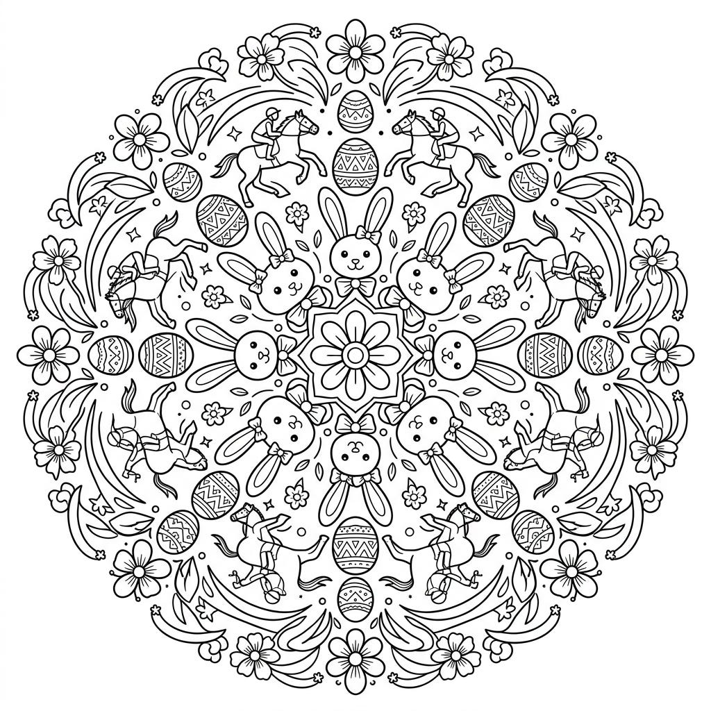 Gallop into spring with this enchanting Easter mandala coloring page, beautifully blending the thrill of jockeys with festive holiday cheer. Discover a symmetrical world filled with adorable bunnies, decorative eggs, and blooming flowers, all ready for your creative touch.