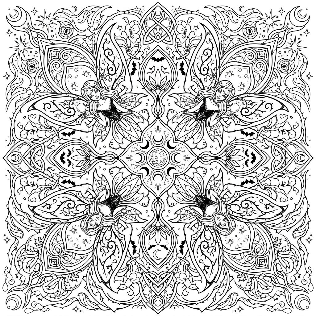 Dive into a world of shadowed beauty with this intricate dark fairy mandala. This complex design features mysterious fairies, celestial symbols, and gothic botanical elements, perfect for a relaxing coloring escape.