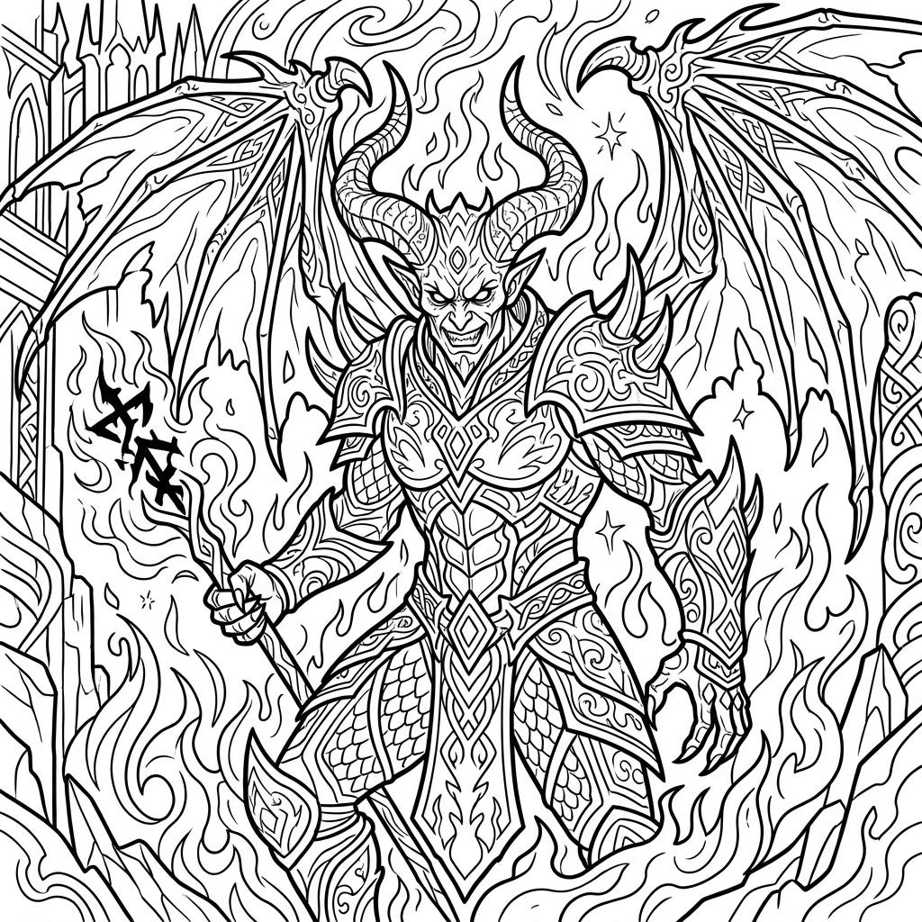 Journey into a realm of dark fantasy with this striking coloring page featuring a powerful, horned demon. Intricate details and a dynamic pose make this a thrilling challenge for any coloring enthusiast.