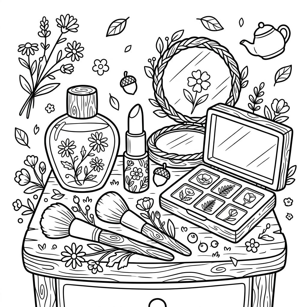 Unleash your child's creativity with this enchanting cottagecore makeup coloring page, perfect for little artists who love rustic charm. Discover delightful beauty items like floral perfumes and wooden brushes, ready to be brought to life with vibrant colors.