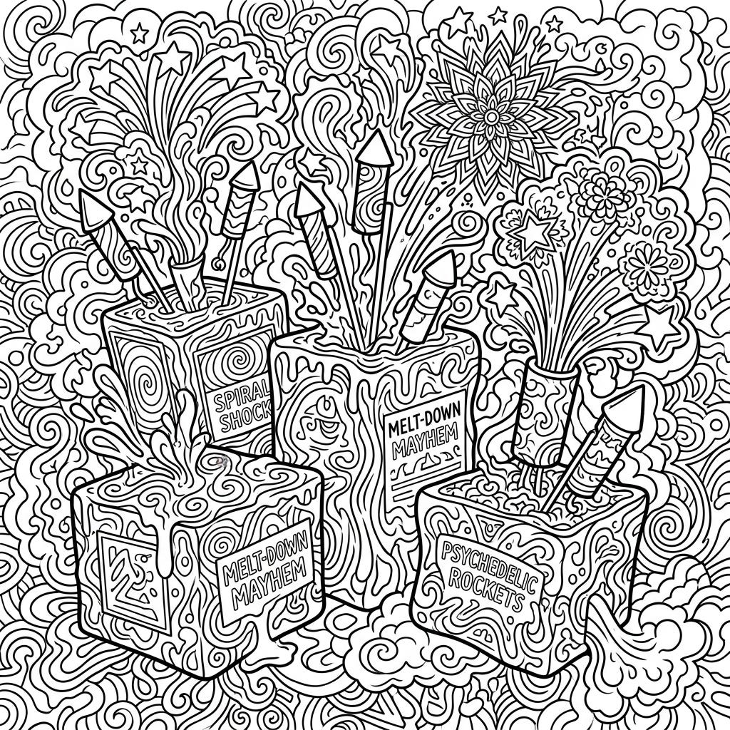 Prepare for an explosion of color with this vibrant psychedelic firework finale boxes coloring page. Immerse yourself in a world of swirling patterns and dynamic bursts, perfect for an imaginative coloring experience.