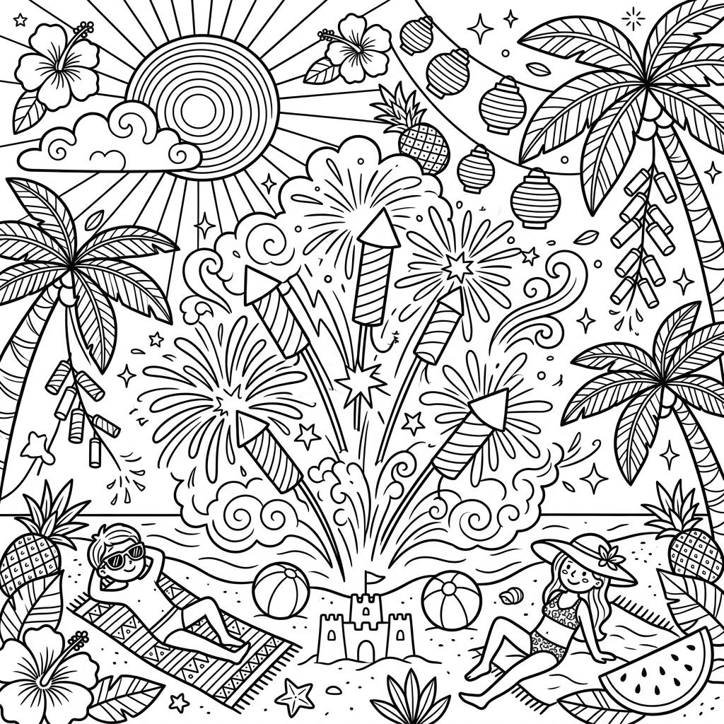 View coloring pageDive into a world of vibrant explosions and sunny celebrations with this lively firecracker and summer beach scene coloring page. Perfect for capturing the joyful spirit of warm weather festivities and creative expression.