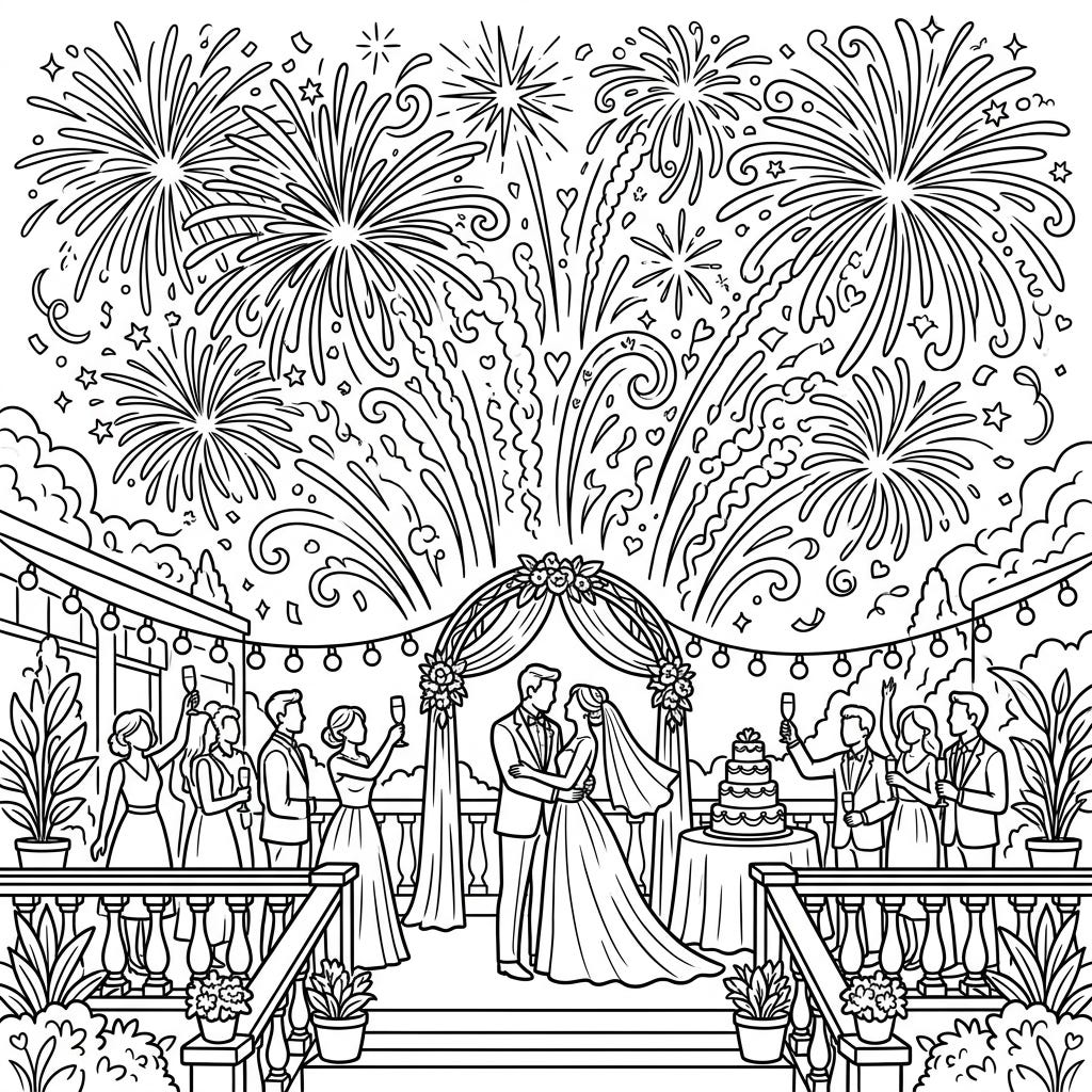 View coloring pageCapture the magic of a summer night wedding with this festive coloring page. It features a joyful couple, lively guests, and spectacular fireworks bursting across the sky, ready for your creative touch.