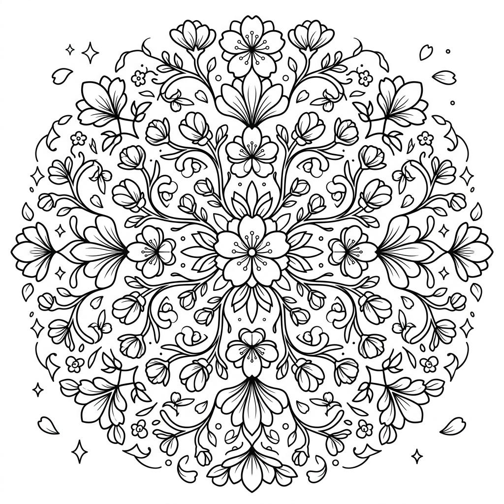 View coloring pageDiscover the serene beauty of our Cherry Blossom Mandala coloring page, an intricate design perfect for moments of calm. This detailed floral pattern invites you to bring the ephemeral charm of spring to life with your favorite colors.