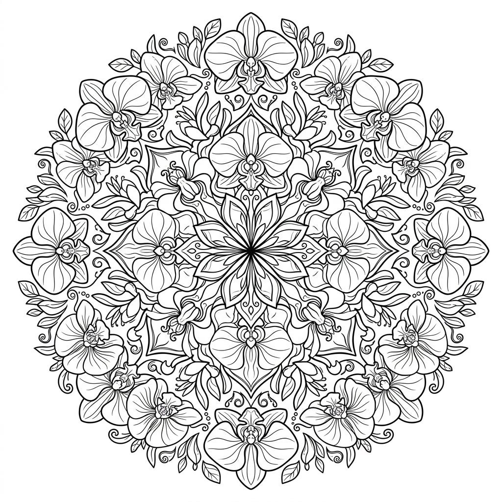 Immerse yourself in the captivating symmetry of this Orchid Mandala coloring page. Featuring exotic orchid blossoms arranged in a detailed radial design, it offers a truly engaging artistic escape.