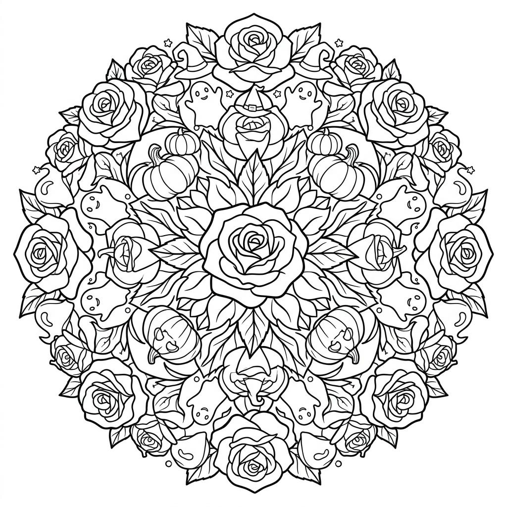 Dive into a world where floral beauty meets spooky fun with this unique Rose Mandala Halloween coloring page. This intricate design blends elegant roses with playful pumpkins and ghosts, offering a captivating challenge for all skill levels.