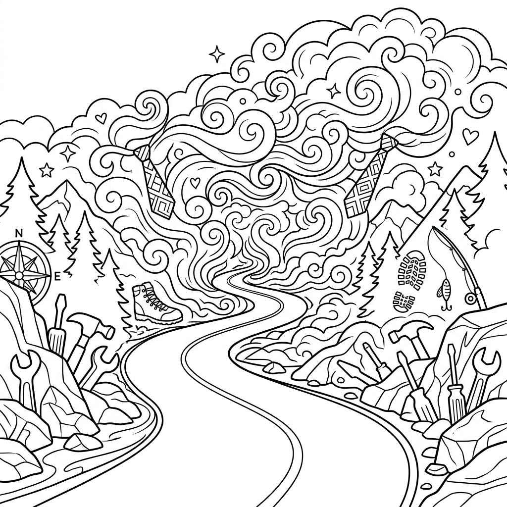 Celebrate Father's Day with an imaginative coloring page featuring a mysterious foggy road. Discover a landscape filled with symbols of adventure and appreciation for dads, from tools to outdoor gear.