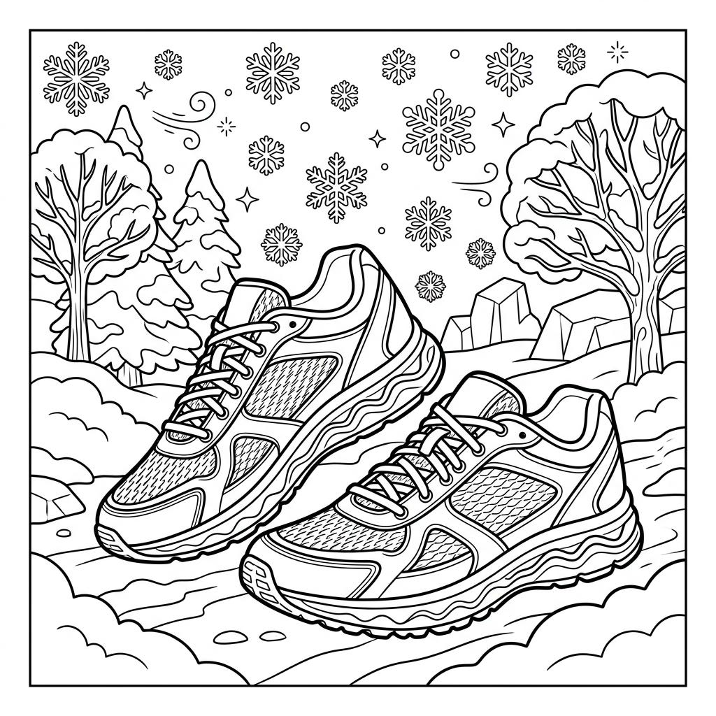 This engaging coloring page features a pair of dynamic running shoes nestled in a beautiful winter wonderland. Dive into a frosty scene complete with delicate snowflakes and snow-covered trees, ready for your creative touch.