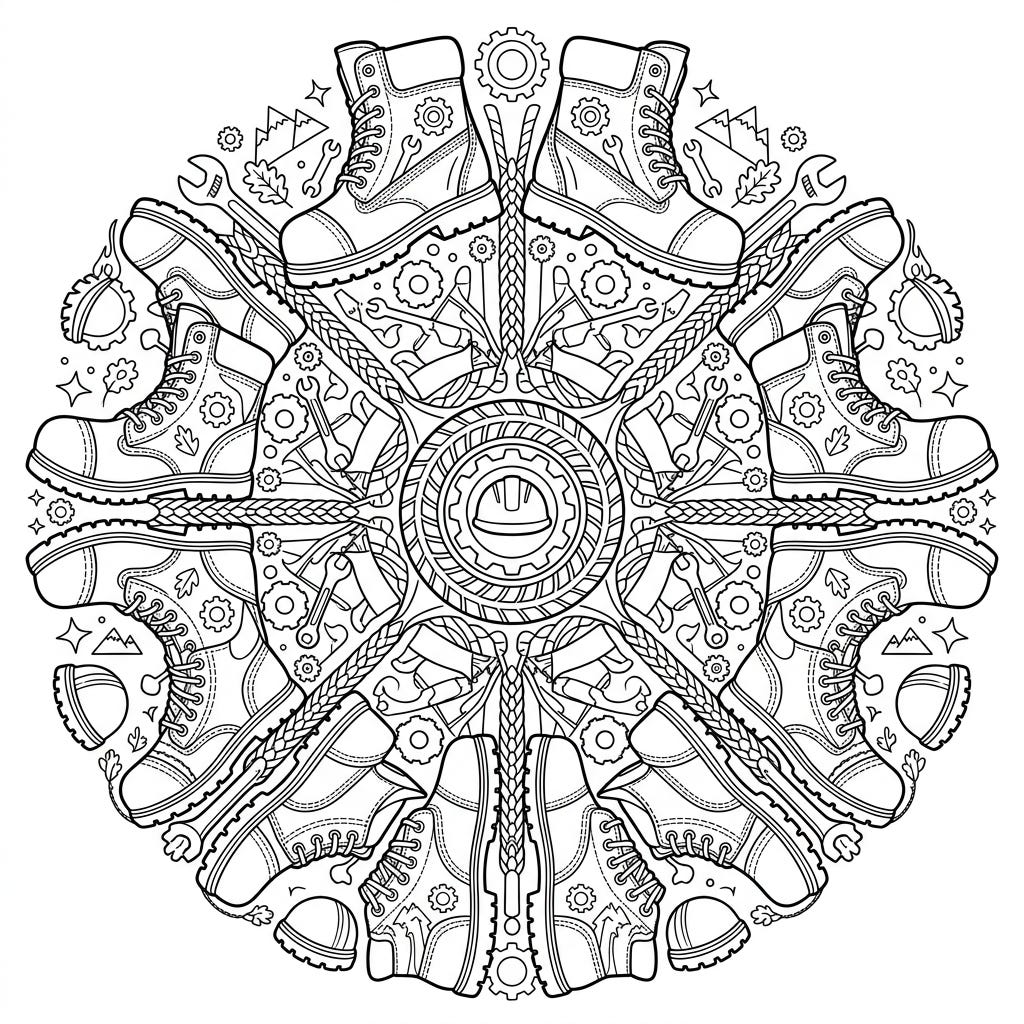 Unleash your creativity with this unique work boots mandala coloring page, perfectly designed for teens. This intricate symmetrical design blends sturdy work boots with industrial elements for an engaging coloring challenge.