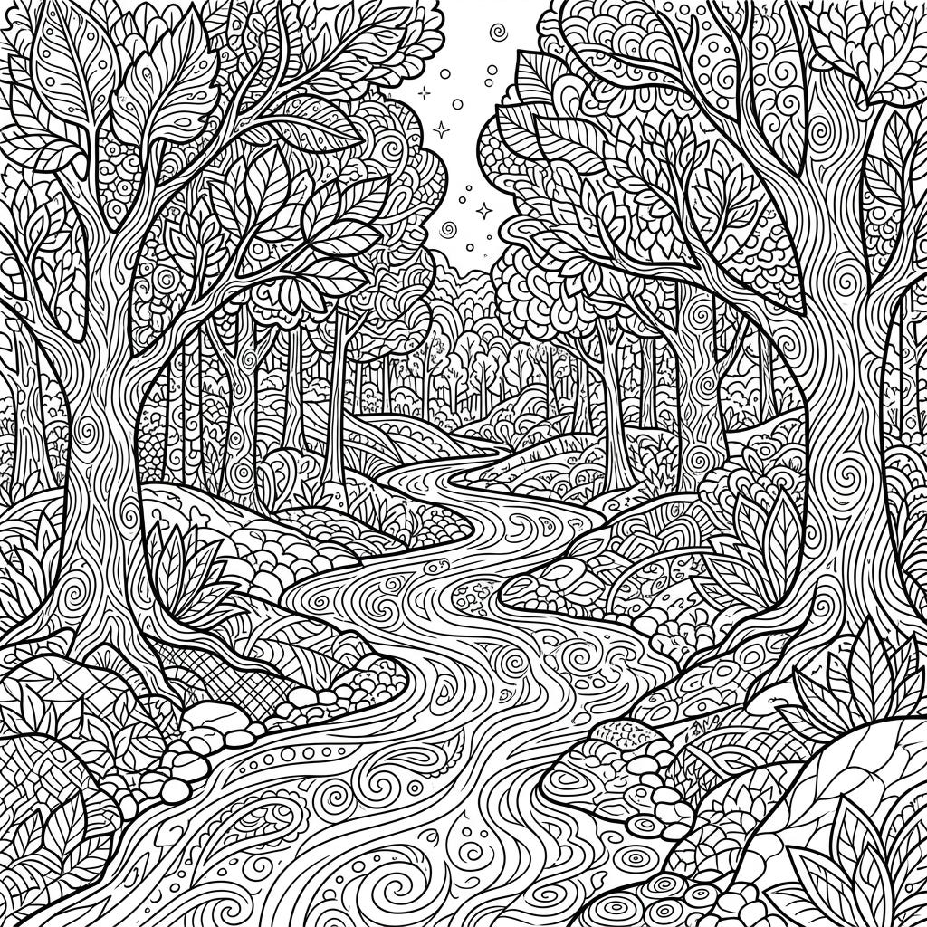Immerse yourself in nature with this stunning Zentangle forest river coloring page. Discover intricate patterns woven into every tree, leaf, and ripple of the winding creek.
