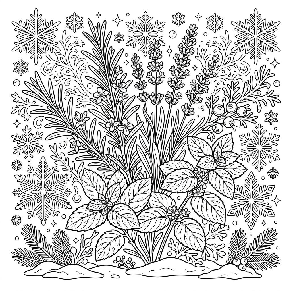 Discover the soothing blend of nature's best in this unique coloring page, where fragrant herbs meet the serene beauty of a winter wonderland. Perfect for a relaxing coloring session that evokes the crisp, cool air and earthy scents.