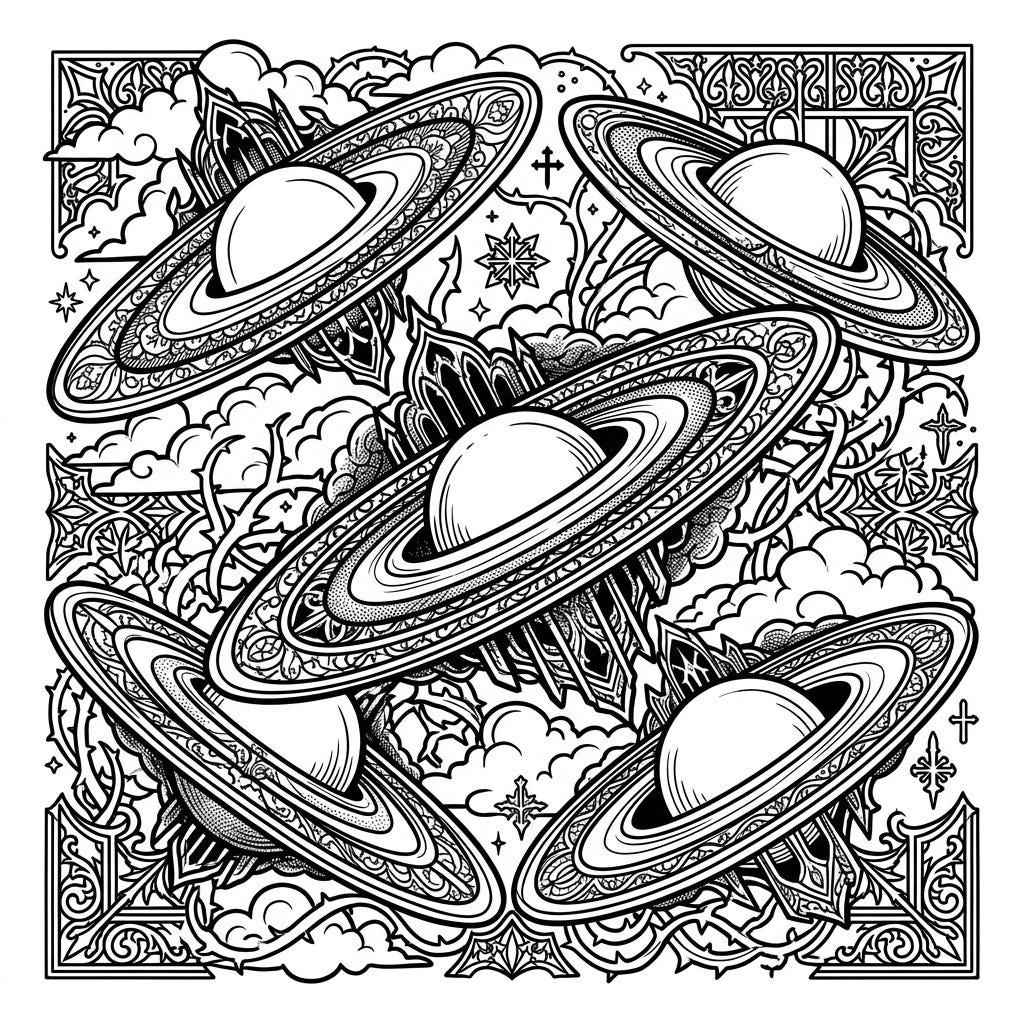 Dive into a unique celestial experience with this Gothic Lenticular Galaxies coloring page. Featuring intricately detailed ringed planets amidst ornate Victorian-inspired cosmic elements, it offers a truly captivating artistic challenge.
