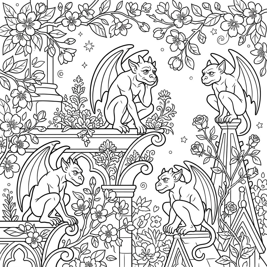 Journey to a fantastical realm where ancient guardians watch over the first signs of spring in this detailed coloring page. Four majestic gargoyles are nestled among blooming cherry blossoms and intricate architectural elements, ready for your artistic touch.