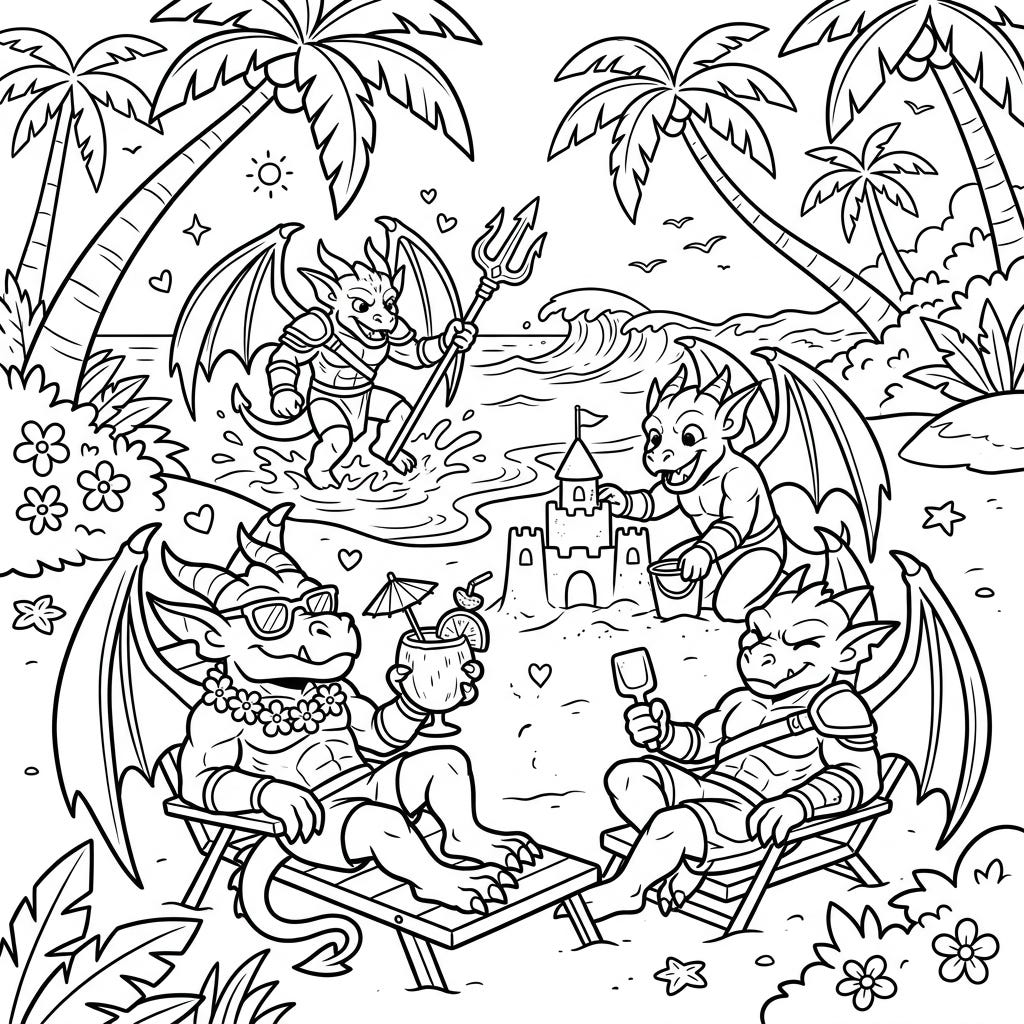 Unleash your creativity with this delightful coloring page featuring warrior gargoyles enjoying a sunny summer beach day. From building sandcastles to splashing in the waves, there's endless fun to color.