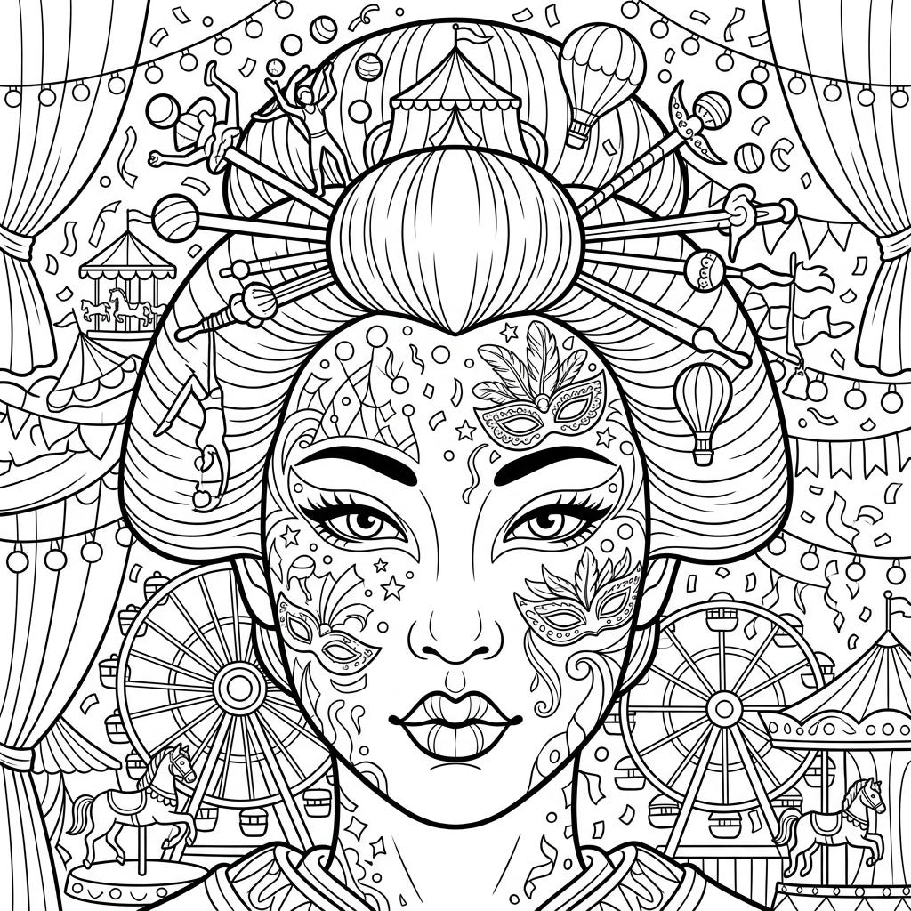 View coloring pageExperience a truly unique artistic fusion with this captivating Geisha makeup coloring page, intricately adorned with vibrant carnival themes. Unleash your creativity as you bring to life circus tents, carousel horses, and festive fireworks on this stunning canvas.