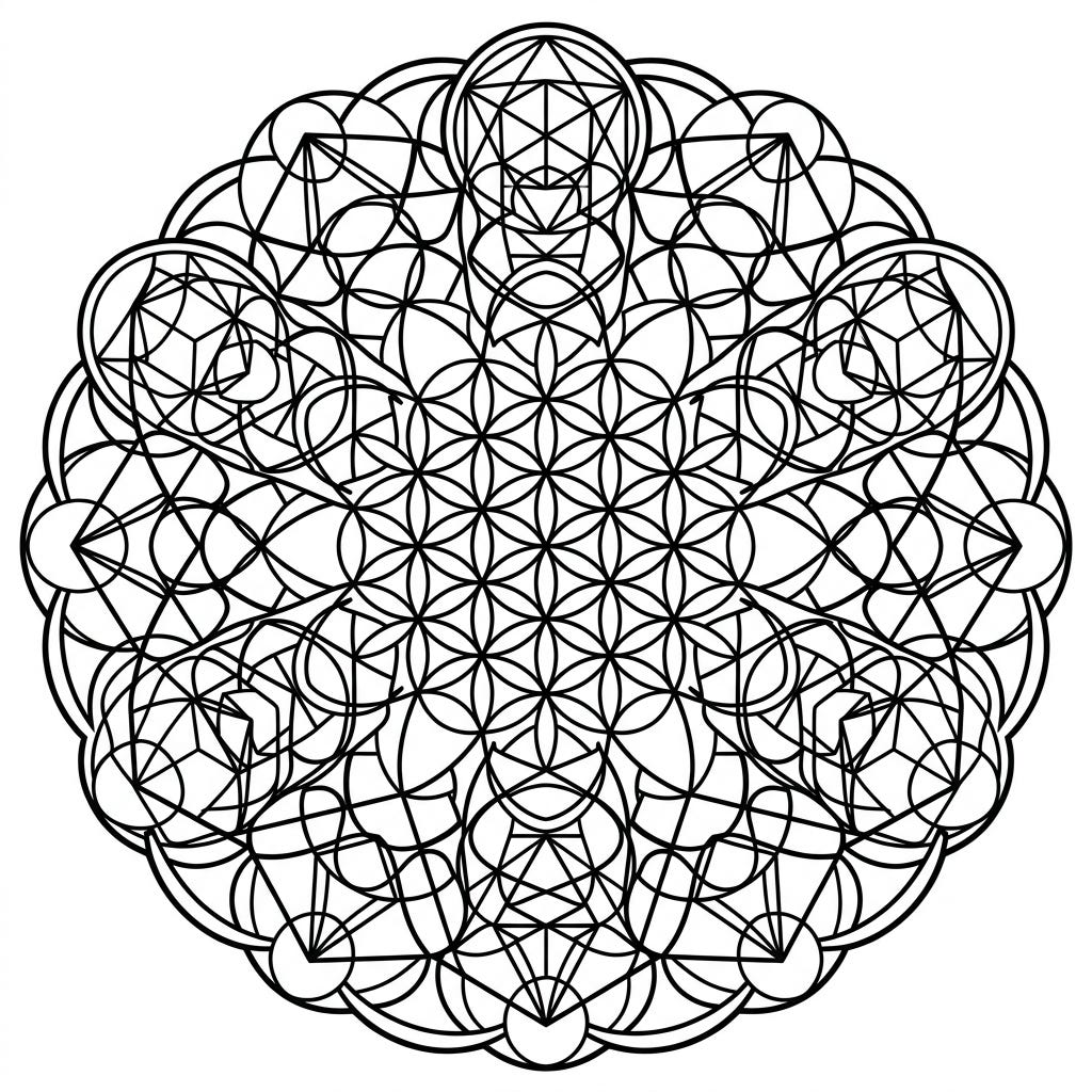 Dive into the mesmerizing world of sacred geometry with this intricate mandala coloring page. Featuring fundamental patterns like the Flower of Life, it offers a deeply calming and creative experience.