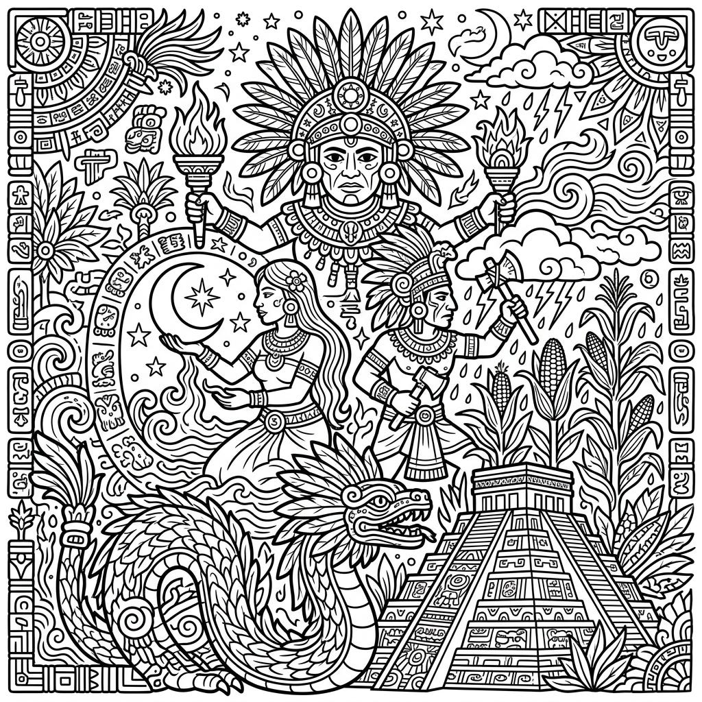 Immerse yourself in the captivating mythology of ancient Mesoamerica with this exquisite coloring page featuring powerful Mayan Gods and Goddesses. Discover a world of deities, feathered serpents, and grand pyramids, ready for your creative touch.