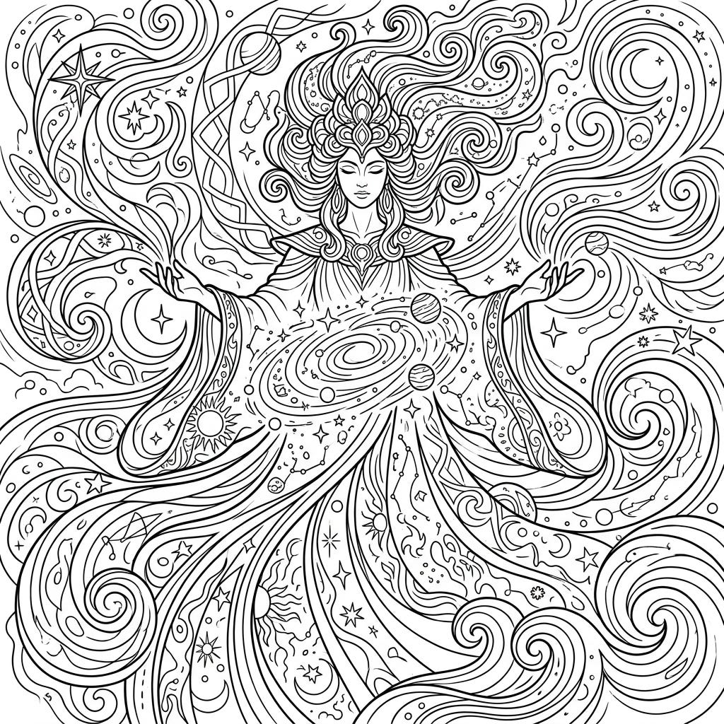 View coloring pageEmbark on an epic coloring journey with this Primeval Creation Deity. This intricate design features a cosmic goddess ready for you to bring her ancient power to life with your favorite colors.