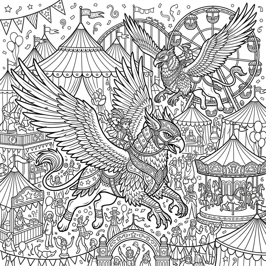 Dive into a spectacular fusion of fantasy and fun with this captivating coloring page, where mighty War Griffins patrol a bustling carnival. This intricate scene offers endless opportunities for vibrant creativity as you bring both mythical beasts and fairground festivities to life.