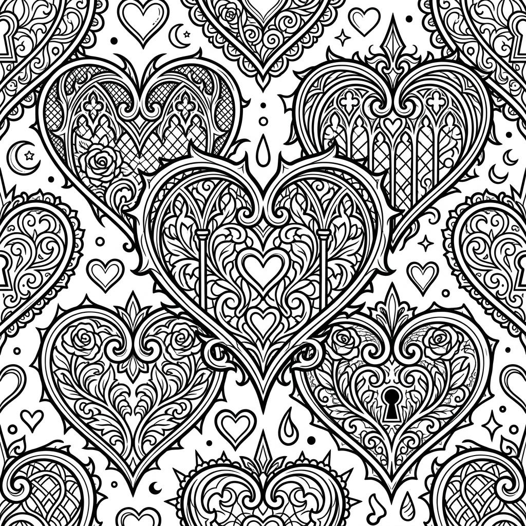 Immerse yourself in a world of dark romance with our intricate Gothic Hearts coloring page. Discover a seamless pattern filled with ornate Victorian lace, roses, and mysterious detailing, offering a captivating artistic challenge.