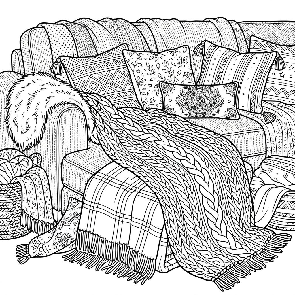 Indulge in the warmth and comfort of a beautifully arranged sofa overflowing with an array of cozy textiles and throws. This intricate coloring page invites you to explore various patterns and textures, creating a comforting scene of relaxation.