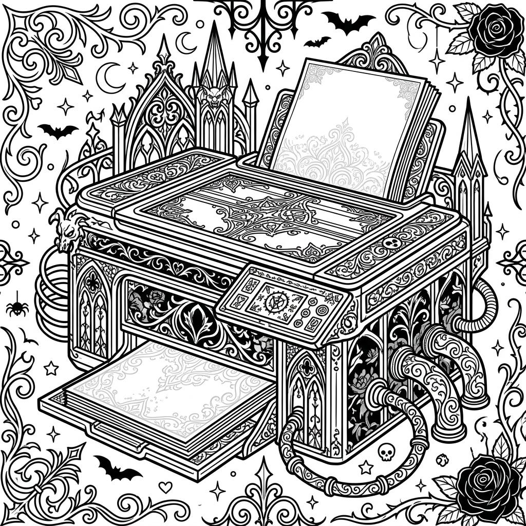 Discover a darkly elegant world with our Gothic All-in-One Printer coloring page, blending modern tech with intricate Victorian aesthetics. Immerse yourself in ornate filigree, mysterious bats, and dramatic spires, ready for your creative touch.