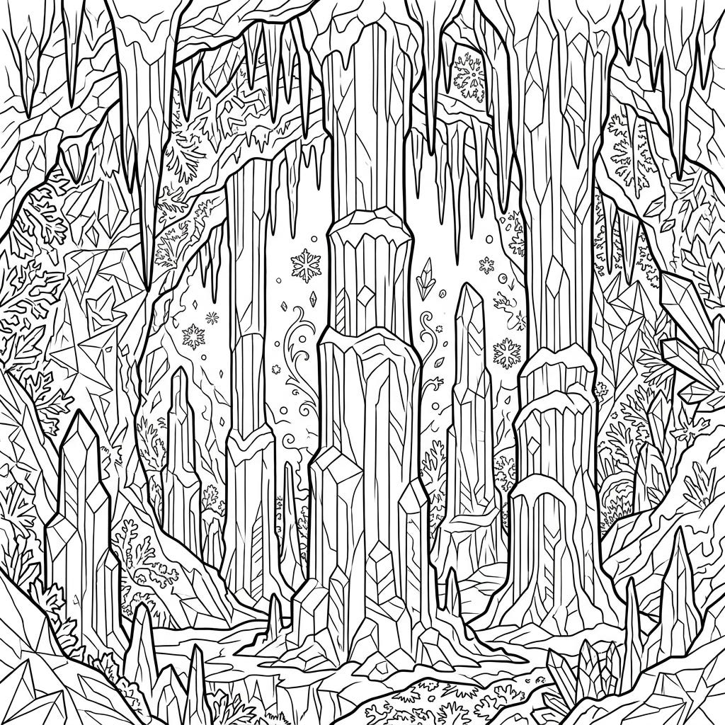 Explore a breathtaking world of frozen beauty with this intricate ice columns coloring page. Dive into a serene cave environment, perfect for unleashing your creativity with cool blues, whites, and shimmering accents.