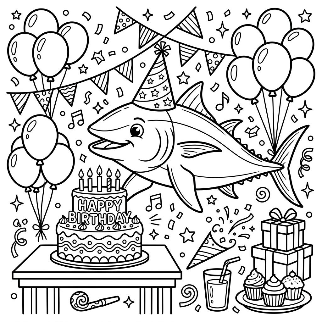 Get ready for an undersea celebration with this adorable Thunnosaurus birthday party coloring page! Join our cheerful fish friend as he enjoys cake, balloons, and all the festive fun, just waiting for your vibrant colors.