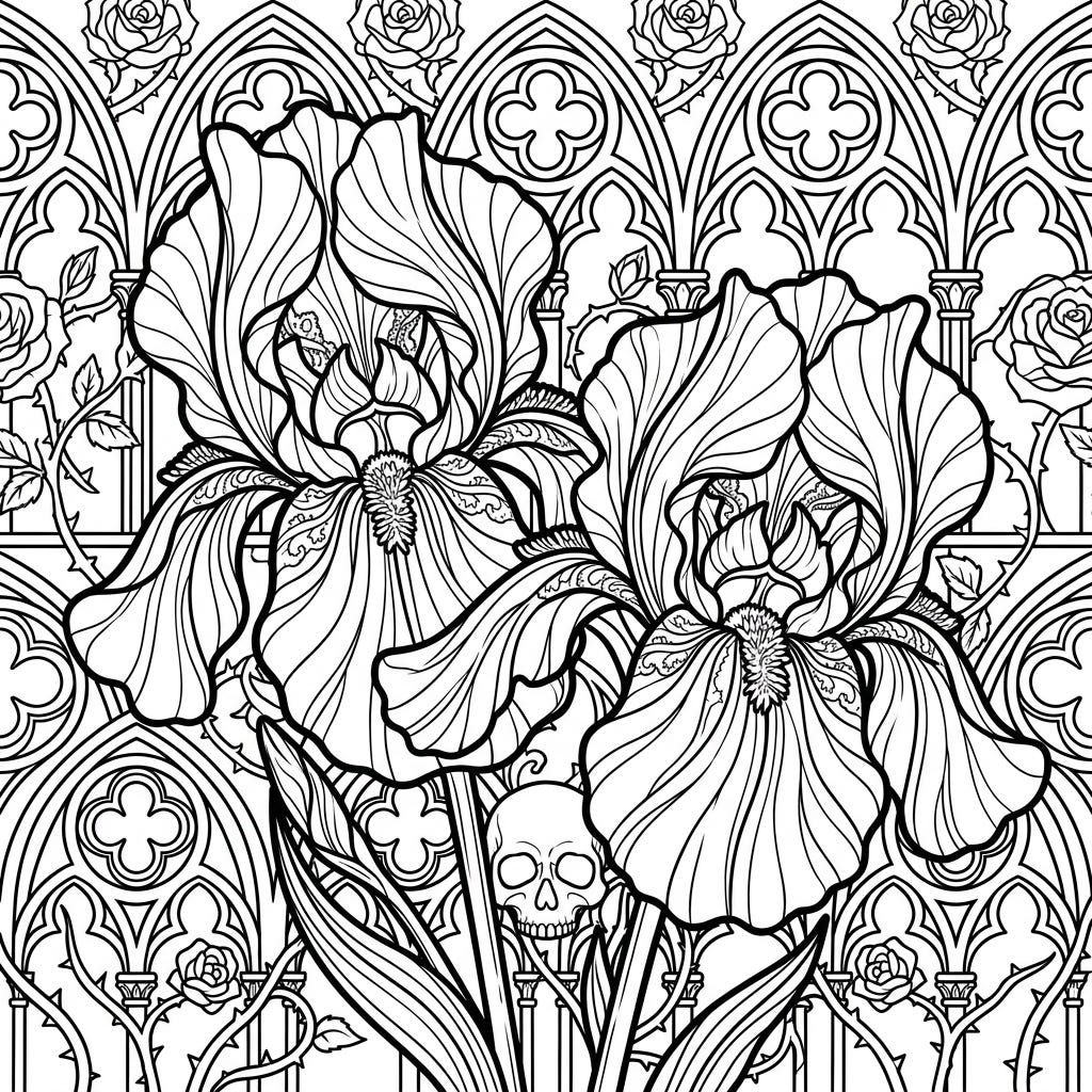 Immerse yourself in a captivating world with this Gothic irises coloring page, blending elegant flowers with mysterious Victorian details. Designed for kids, it offers a perfect balance of recognizable shapes and moderate intricacy for a fun, creative experience.