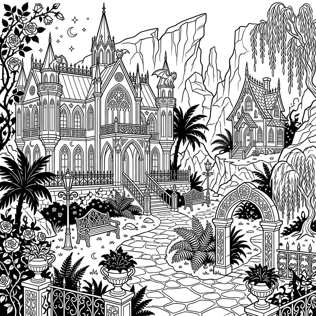Step into a world where Victorian elegance meets tropical mystery with this captivating Gothic Resort Island coloring page. Discover intricate architecture, lush dark foliage, and dramatic shadows awaiting your artistic touch.