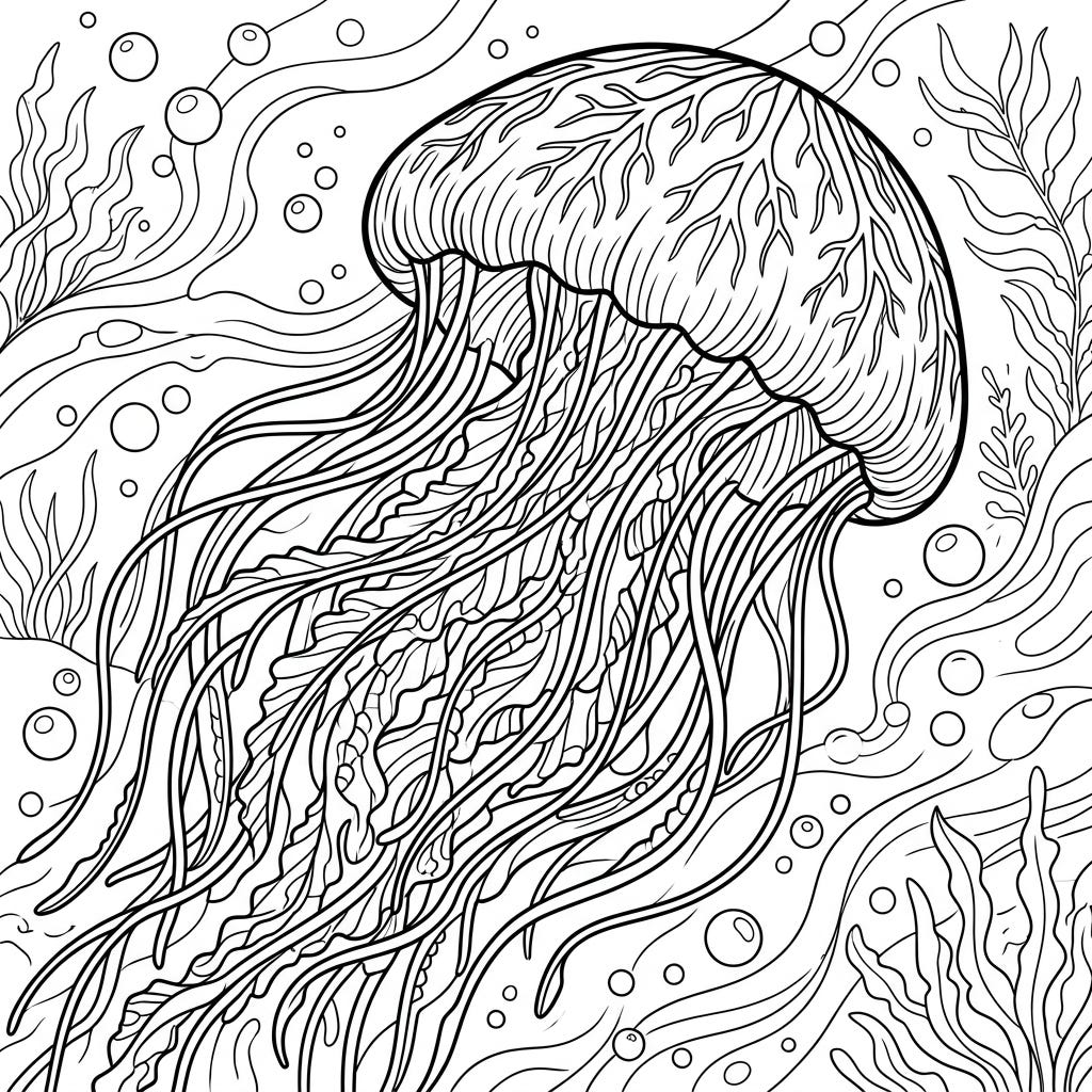 View coloring pageDiscover the mysterious beauty of the deep sea with our intricate Pink Meanies Jellyfish coloring page. This captivating design offers hours of creative relaxation, blending detailed marine life with an immersive underwater scene.