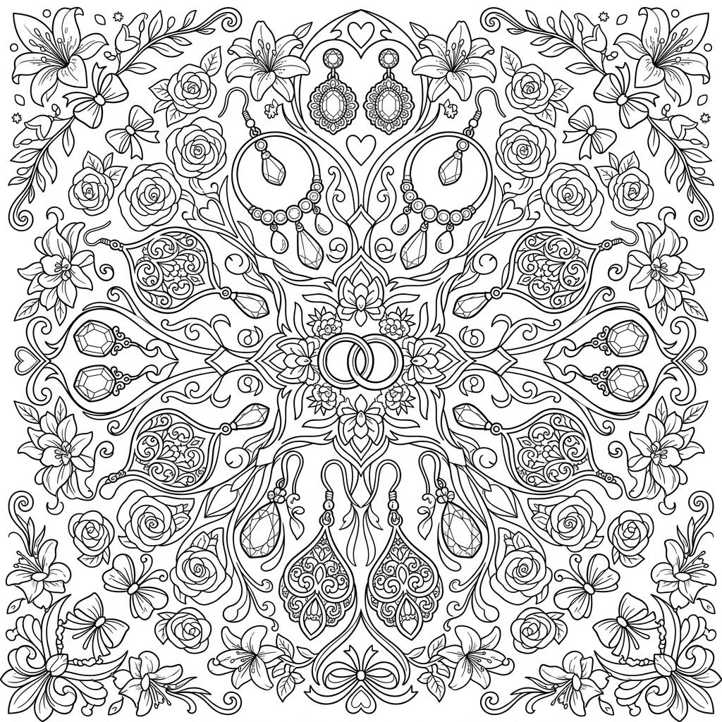 Discover an exquisite wedding-themed mandala featuring intricate bridal earrings and romantic floral designs. This elegant coloring page invites you to celebrate love and creativity with every stroke.