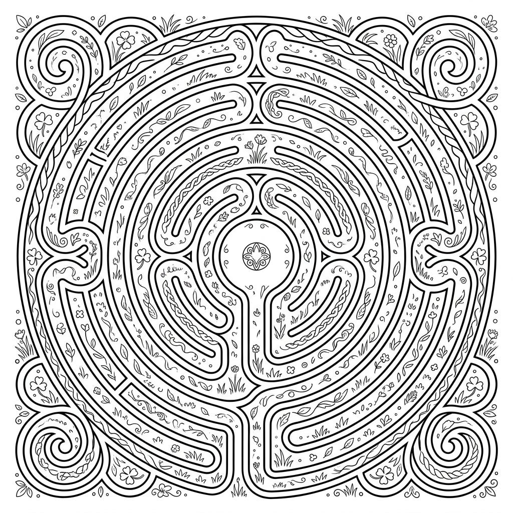 Immerse yourself in the calming beauty of this intricate turf labyrinth coloring page, adorned with delicate botanical details. This unique design offers a meditative escape, inviting you to bring its winding paths and natural elements to vibrant life.