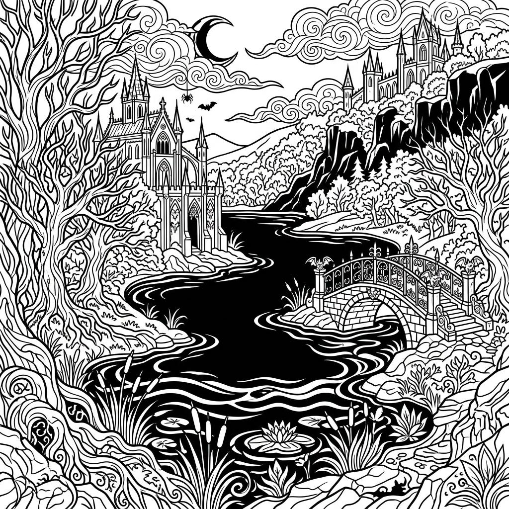 Dive into a world of shadowed beauty with this gothic artificial lake coloring page. Featuring majestic castles, intricate trees, and a mysterious bridge, it promises a uniquely captivating creative experience.