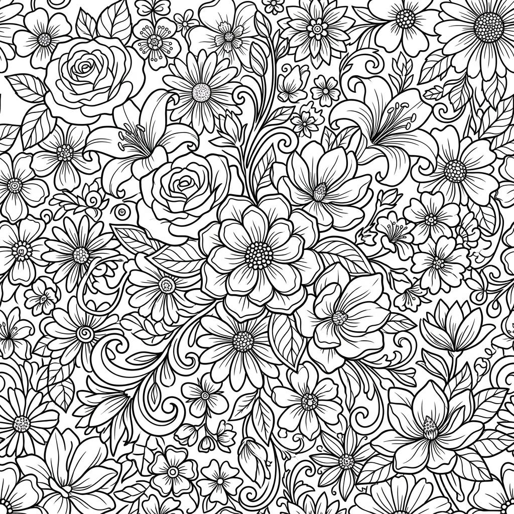 View coloring pageDive into a world of botanical beauty with this exquisite floral line art coloring page. Featuring a dense tapestry of roses, lilies, and daisies, it offers a delightful challenge for all coloring enthusiasts.