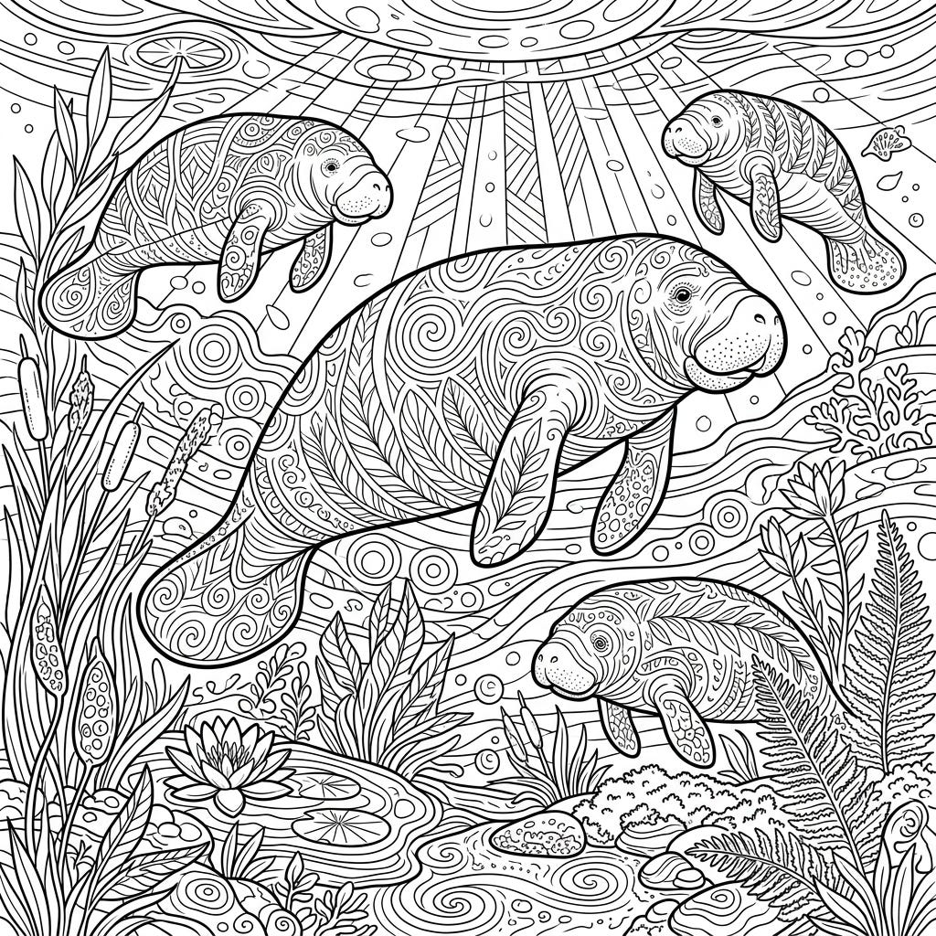Immerse yourself in the serene world of manatees gracefully navigating warm freshwater springs. This intricate adult coloring page offers a relaxing escape for experienced colorists.