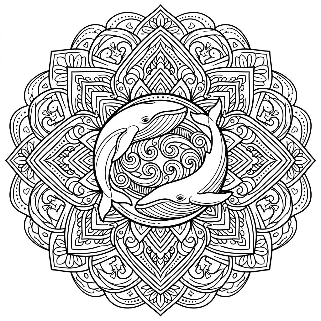 Embark on an oceanic journey with this stunning Blue Whale Mandala coloring page. Featuring two graceful whales at its heart, this intricate design offers a peaceful and engaging artistic escape for all ages.