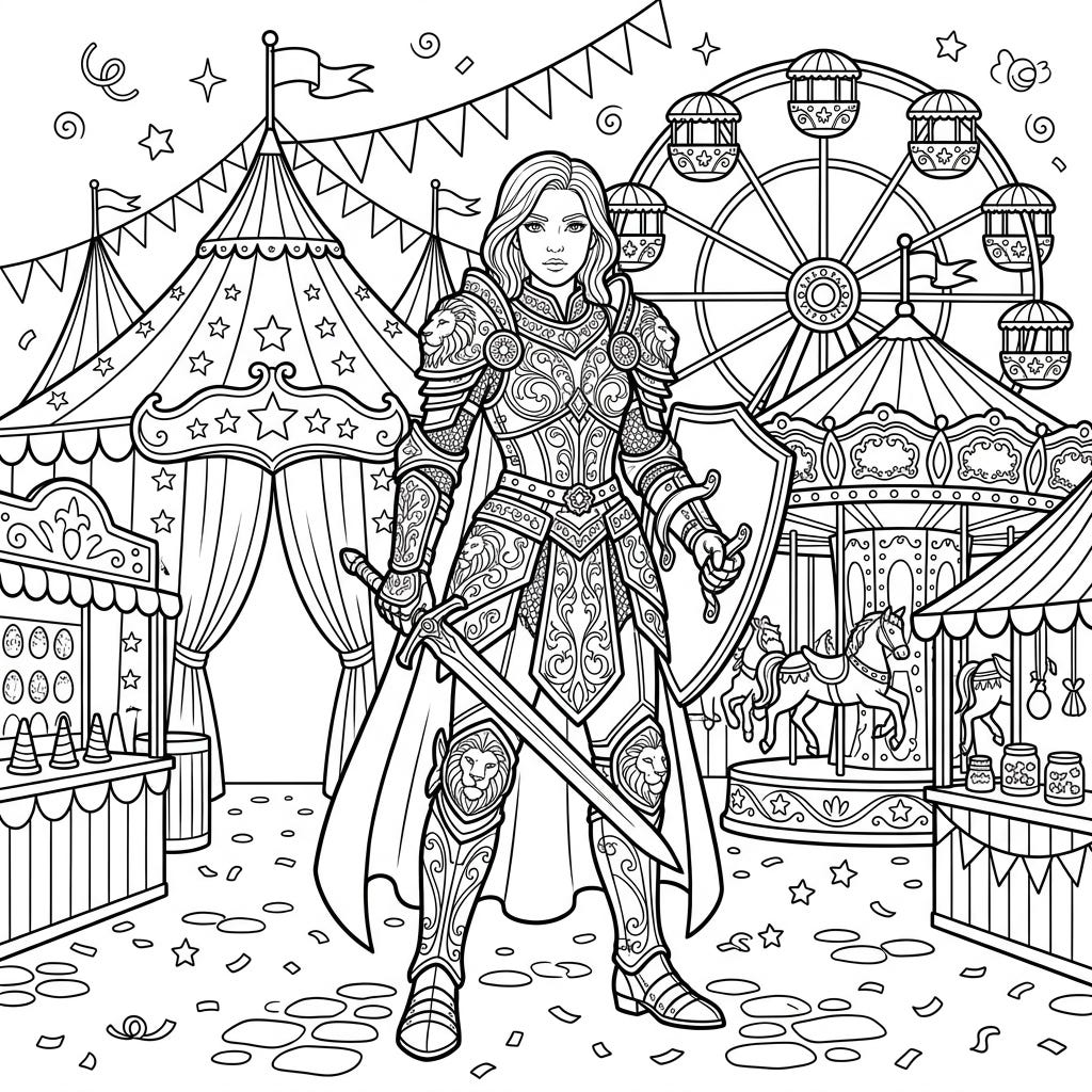 Step into a world where medieval valor meets carnival delight with this intricate adult coloring page. Featuring a noble paladin surrounded by festive fairground attractions, it promises hours of creative engagement.