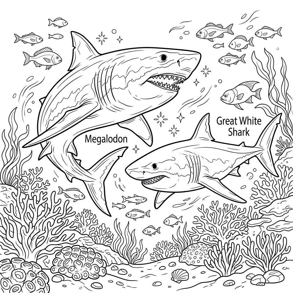 Explore the awe-inspiring differences between the ancient Megalodon and the modern Great White Shark with this captivating coloring page. Perfect for marine biology enthusiasts, this detailed illustration offers a unique comparison of two legendary ocean predators.