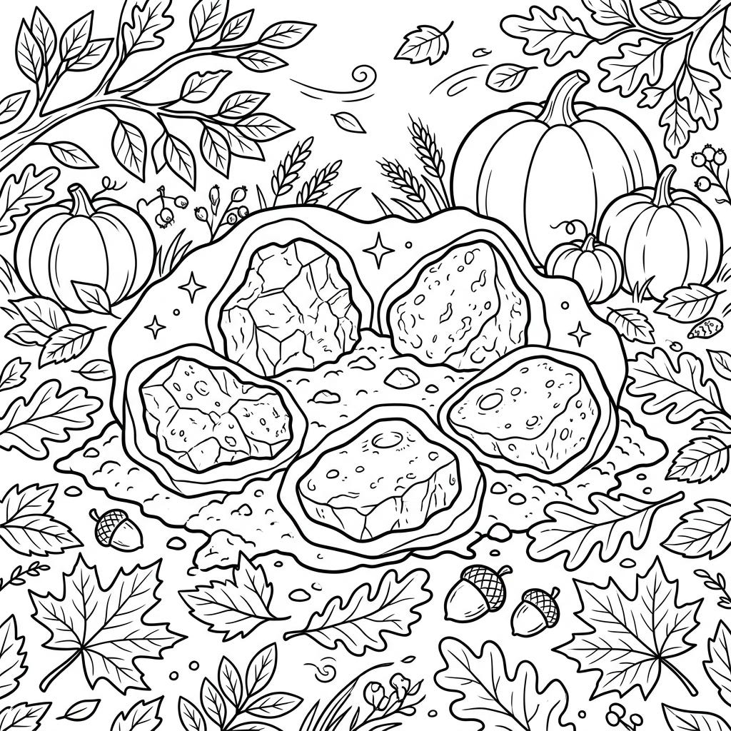 Journey to a unique landscape where scientific discovery meets seasonal charm with this Moon Rocks in Autumn coloring page. Explore lunar samples nestled amongst falling leaves, plump pumpkins, and harvest delights, ready for your creative touch.
