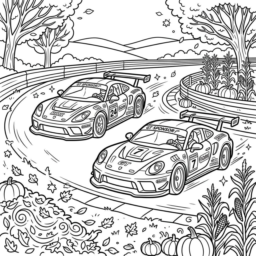 View coloring pageImmerse yourself in the thrill of GT racing as two powerful cars speed through a scenic autumn track. This dynamic coloring page, featuring falling leaves and harvest decor, offers an exciting challenge for teens.