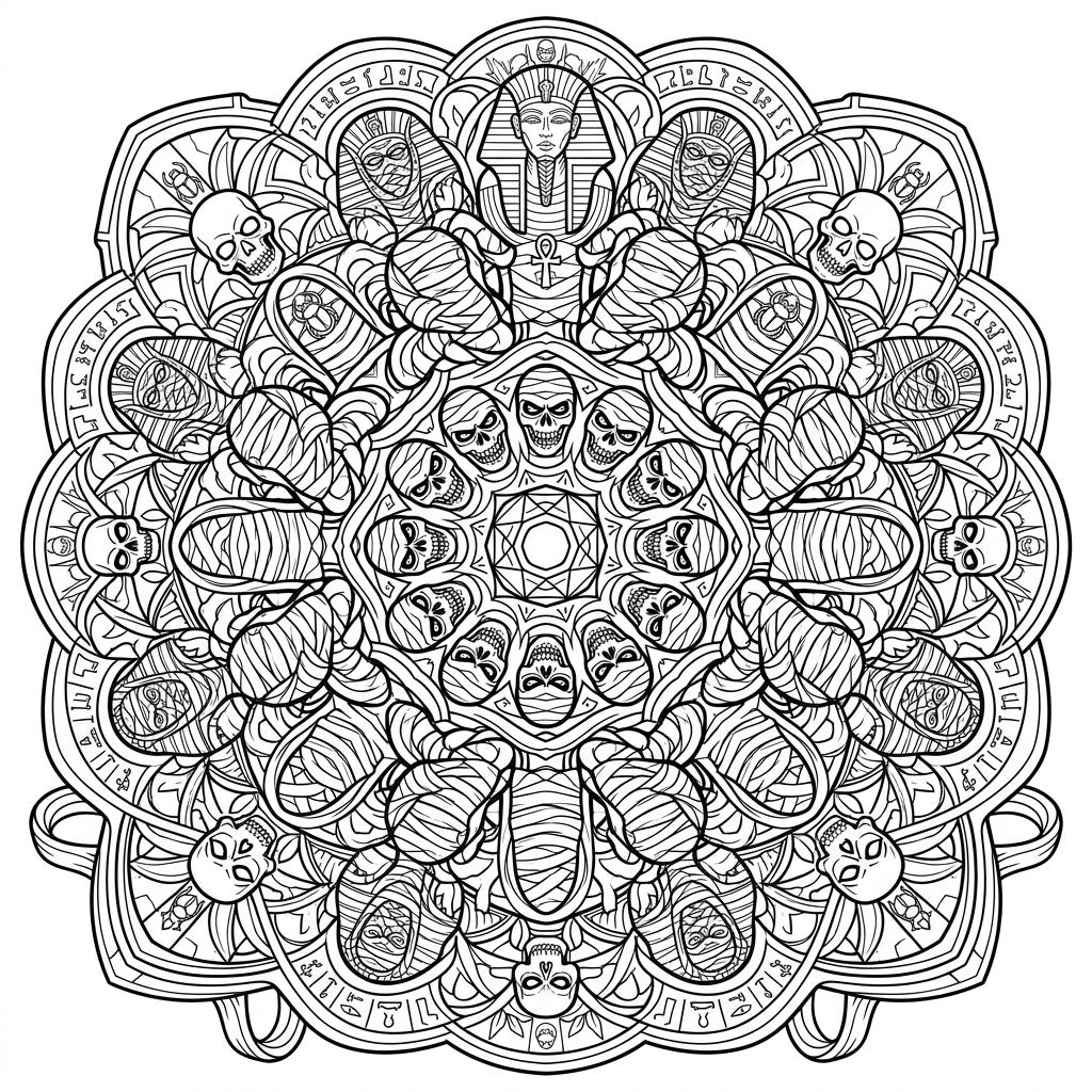 Embark on an eerie artistic journey with this captivating Horror Mummy Mandala. Its intricate design, filled with reanimated ancient spirits, offers a unique and thrilling coloring experience for enthusiasts.