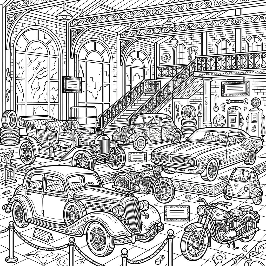 Immerse yourself in the fascinating world of vintage vehicles with this exquisitely detailed automotive museum coloring page. Designed for adults, it offers a relaxing and intricate journey through automotive history.