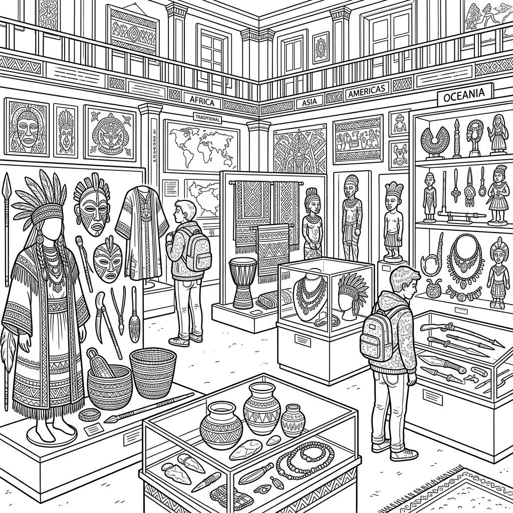 This intricate coloring page invites teens to explore a rich ethnography museum filled with fascinating cultural artifacts. It's designed to spark curiosity about diverse traditions while offering a wonderfully detailed canvas for creative expression.