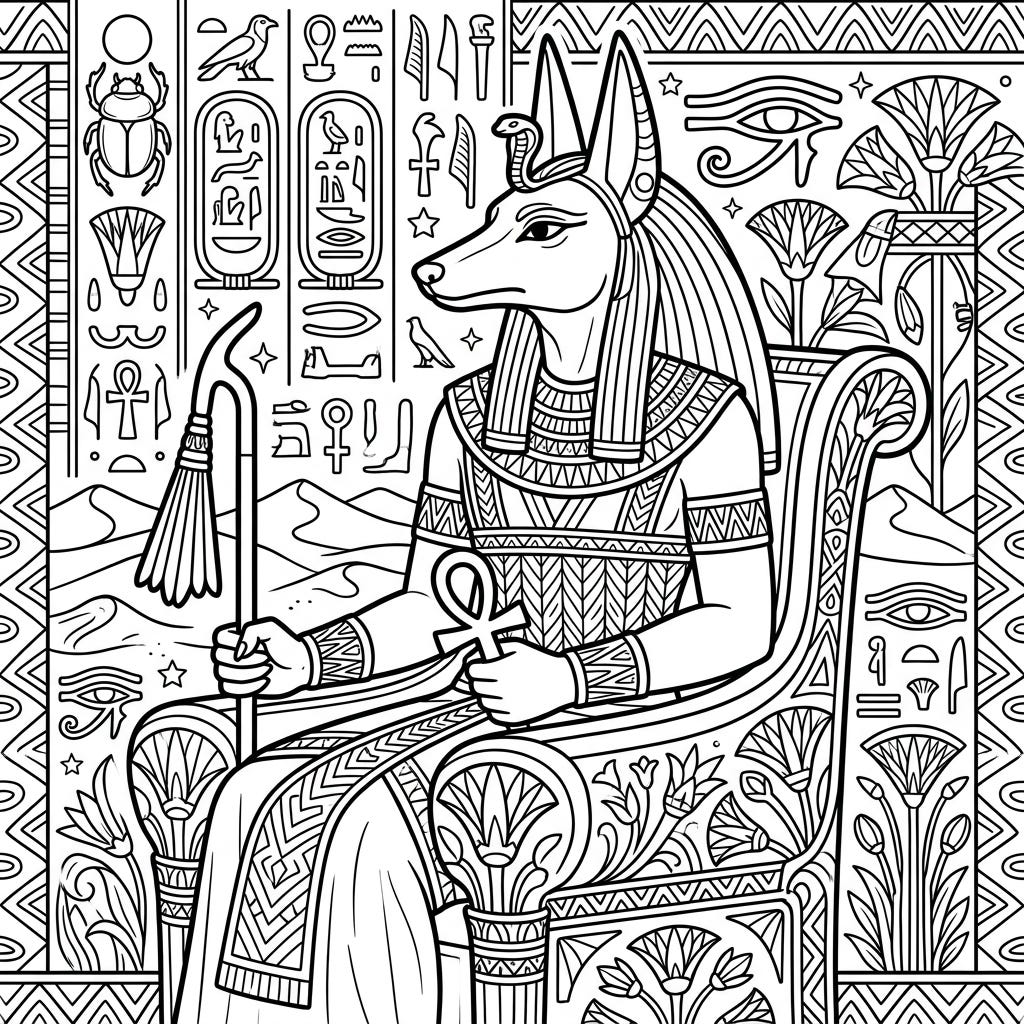 Journey into the mysteries of ancient Egypt with this captivating coloring page featuring the powerful god Anubis. This intricate design offers a rewarding artistic experience for adults and teens alike.