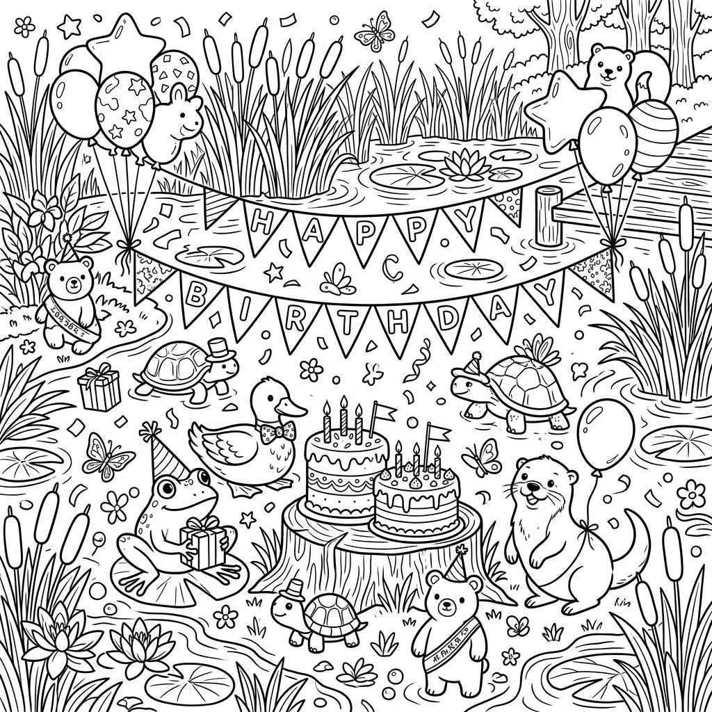 Step into a charming wetlands birthday party where nature meets celebration! This delightful coloring page is packed with adorable animals and festive details, perfect for bringing vibrant hues to life.