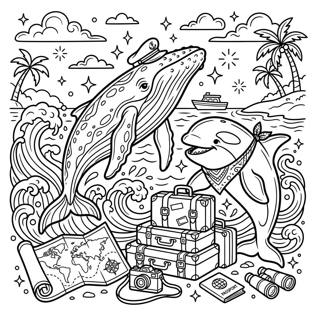 View coloring pageEmbark on an epic journey with our delightful whales on vacation coloring page. Join a globetrotting humpback and a map-reading orca as they explore the world, ready for your creative touch.